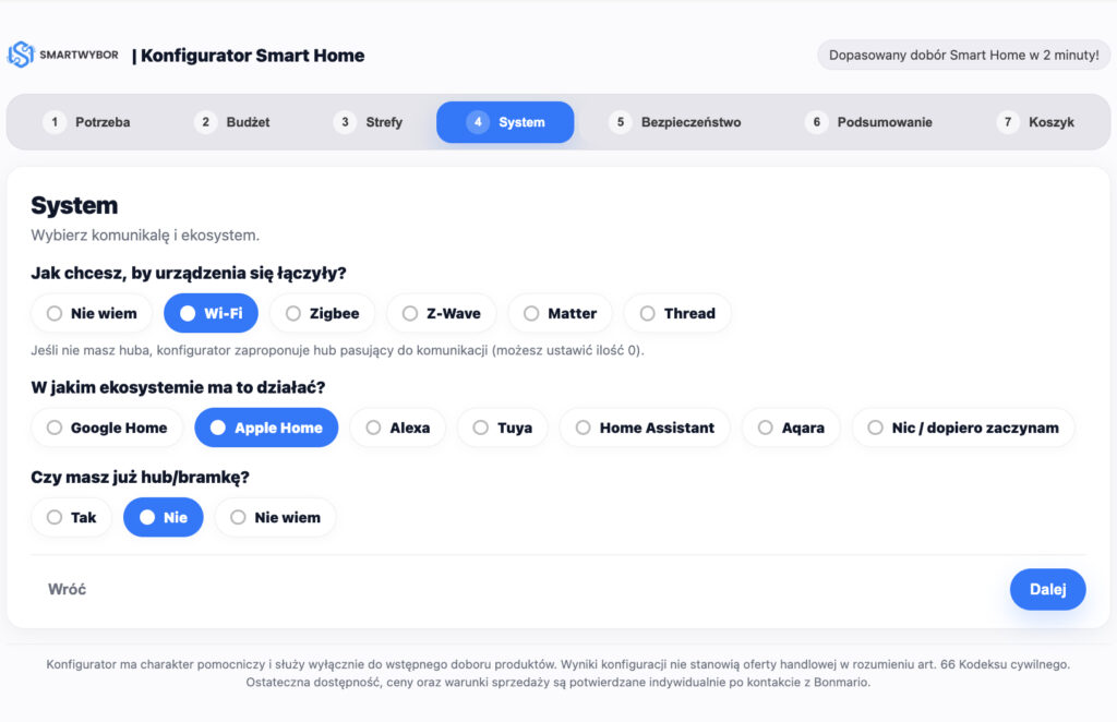 Odpowiedz na kilka pytań, a my dobierzemy kompatybilne produkty smart home. Na końcu przejdziesz do koszyka Bonmario.com - tam finalizujesz zakup (płatność, wysyłka i gwarancja).